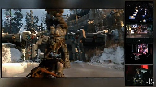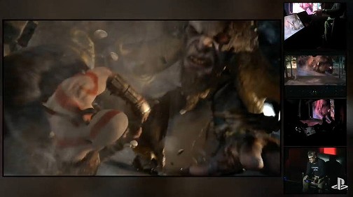 雪の残る山中を舞台に,クレイトスと少年が狩りをしていると,突如としてクリーチャーが。会場内からはどよめきが。