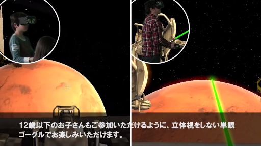 12歳以下のお子様にもご参加いただけるように、立体視をしない単眼ゴーグルでお楽しみいただけます。またクロマキー合成による演出も可能で、リアルタイムで第三者視点で合成したプレイ映像で記念撮影ができるなど、プレイヤー以外も楽しむことができます。