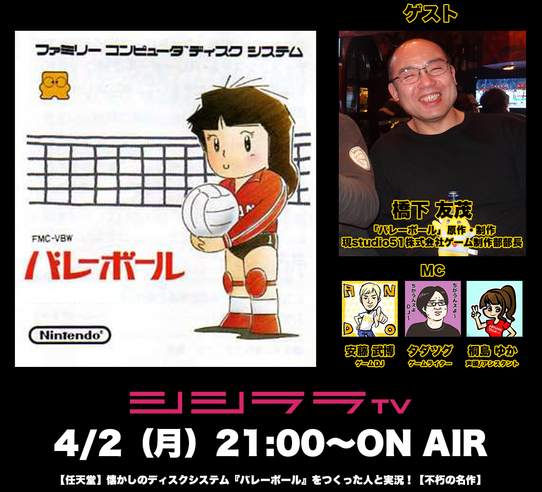 シシララTV,4月2日放送「つくった人がゲーム実況」はディスクシステムの「バレーボール」を特集