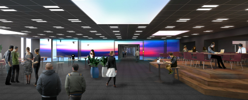 会員制のエリア,貸しオフィス,貸し会議室に加えて,オープンラウンジも用意されており,グループの従業員と外部の方が触れ合える機会を設けたり,大型LEDビジョンによるセミナーやイベントを実施したりするという。
