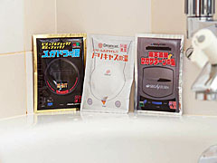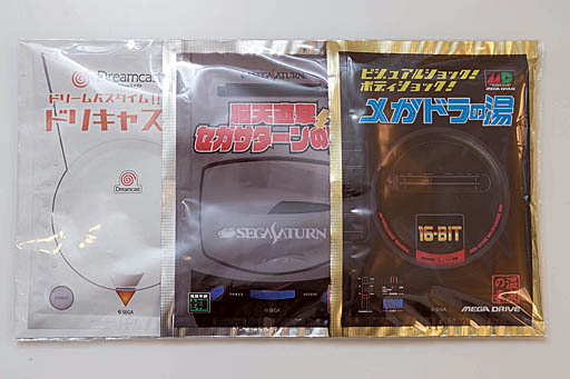 「セガハード 温泉の素3種セット」は要するに上記3機種をイメージした入浴剤で,機種のカラーとフレーバーでそれらを再現しているそうだ。理屈がすんなり頭に入ってこないが。
