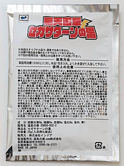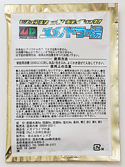 パッケージには,「ビジュアルショック! ボディショック! メガドラの湯」とリズムのいい文字が踊っているので,とりあえず,声に出して読んでみることをオススメする。テンションが高まるはずだ。なお,振ってみたところ,内部で粉末が移動する音は聞こえるものの,謎のカラカラ音は発生せず,少々残念だ。
