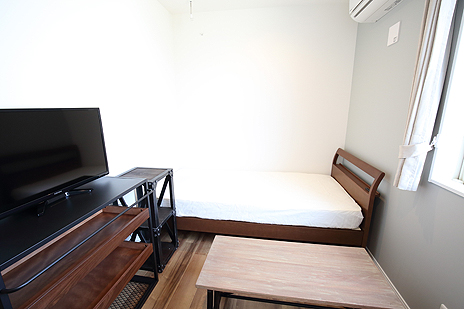 一棟の物件(入居者4〜7人)に対して、キッチン、レンジ、炊飯器、キッチン用品、ダイニングスペース、シャワールーム、洗面台、トイレ、洗濯機、乾燥機、掃除機etc.を用意しています。各居室にはベッド、収納ケース、ハンガーラック、冷蔵庫、ケトルが完備されています。