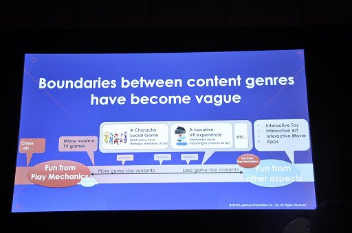 しかしながらゲームが多様化する中で,ゲームメカニクスが中心となっているわけではないのに,「ゲーム」として楽しまれている作品(インタラクティブな玩具/アート/映像/各種アプリケーションなど)は急激に増えていった。そして現代においては「キャラクターを愛でるソーシャルゲーム」や「VRを利用した物語体験」といった作品があちこちで作られており,そしてこれらの「どこからどこまでがゲームなのか」という境界線は大変に曖昧なものとなっている。