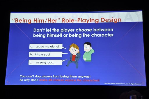 「ゲーム内のキャラクターになりきって,ゲーム世界やゲームが提供する物語を楽しむ」というのもまた,ゲームの楽しまれ方のひとつだ。けれども「ロールプレイ」と言っても,その実装には大きく分けて2つの方向性があることには注意が必要だとPrasertvithyakarn氏は指摘する。