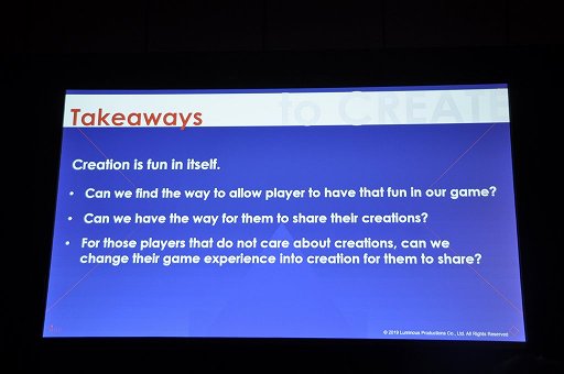 また「作る」ことに興味のないプレイヤーに対しても,スクリーンショットという創作物をシェアしてもらうことはできるし,そのようにゲームを設計することもできる……が,これは,「キャラクターの自撮りが撮影できて,それをネットでシェアできればいい」という話ではない。大事なのはプレイヤーがゲーム内で体験したことを,シェアできる形状に変化させて提供する,ということだ。