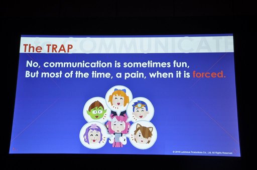 Prasertvithyakarn氏はこの項目を提示しつつも,同時に「とはいえコミュニケーションは,常に楽しいとは限らない」と語った。実際,コミュニケーションが強制されてしまうと,それは楽しいどころか,ときに苦痛にすら転じてしまう。