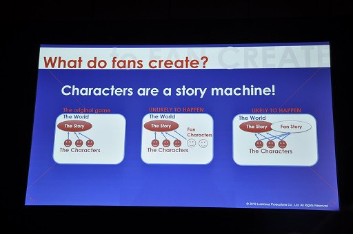 まずそもそもゲームにおける二次創作は,「ファンがオリジナルのキャラクターを作って,ゲームが提供する物語世界で活躍させる」よりも「ゲームに登場するキャラクターが,ゲームとは異なる物語を展開させる」ほうが多いとPrasertvithyakarn氏は語った(若干,一部で戦争が起きそうな見解だが,今はそこで争う場面ではないだろう)。