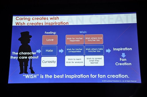 しかるにキャラクターに対する愛は,そのキャラクターの幸福を望むようになり,また他のプレイヤーもまた自分が愛するキャラクターを愛してほしいと望むようになる。それがインスピレーションとなって,二次創作が生まれる。