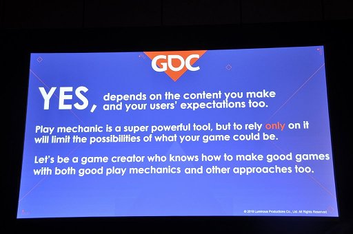 講演の最後にPrasertvithyakarn氏は,「ゲームメカニクスは大変に強力なツールだが,それだけに頼ってしまうと,あなたが作れるゲームの可能性が制限されてしまう」と指摘。「良いゲームメカニクスと,それ以外のアプローチの両方の使い方を知っているゲームデザイナーを目指すべきだ」と語って,講演を終えた。