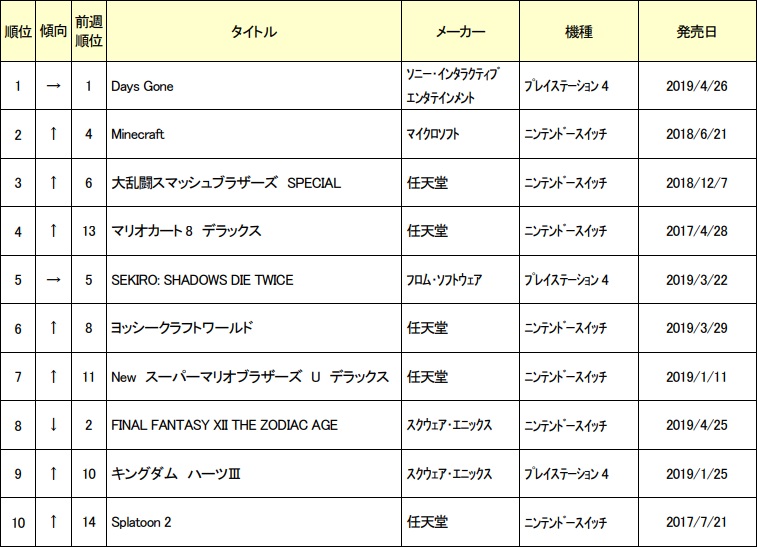 ゲオ,2019年5月1週目の新品ゲームソフト売上ランキングTOP10を公開。「Days Gone」が2週連続で首位