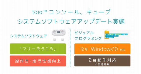 ソニー・インタラクティブエンタテインメント(以下SIE)は、子どもの創意工夫を引き出すロボットトイ「toio(トイオ)」のtoioコア キューブ(以下キューブ)およびtoioコンソールに向けたシステムソフトウェアのアップデートを行います。本アップデートにより、専用カートリッジが無くても楽しめる「フリーそうこう」機能等が追加されるだけでなく、2019年12月からビジュアルプログラミングがWindowsでも利用できるようになります。