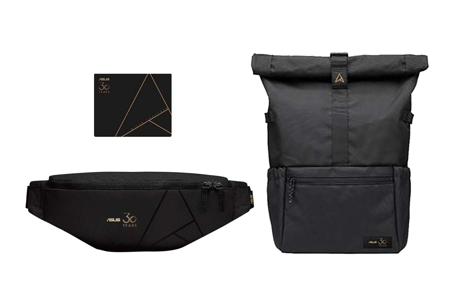 ASUS30周年を記念して作られたマウスパッド,ウエストポーチ,バックパックの3点をまとめてお届けします。いずれも「ASUS 30 YEARS」のロゴが入ったシンプルなデザインです。