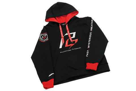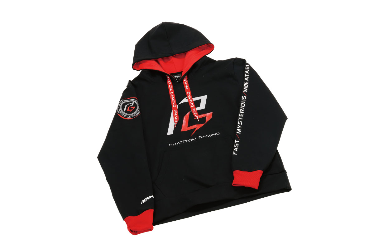 マザーボードメーカーASRockのゲーマー向けブランド「Phantom Gaming」のロゴ入りパーカー(Mサイズ)です。左腕には「Phantom Gaming」がコンセプトとして掲げている“Fast / Mysterious / Unbeatable”が書かれています。