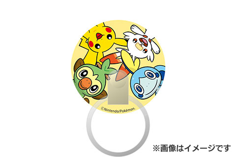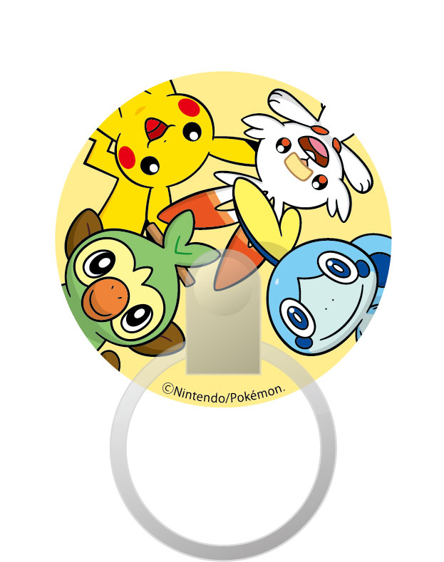 「ポケモン」のオリジナルスマホマルチリング(非売品)です。「ポケットモンスター ソード・シールド」に登場するサルノリ・ヒバニー・メッソン,そしてピカチュウが描かれており,大事なスマートフォンを滑り落ちの危険から守ります。