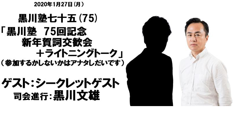 2020年初回の黒川塾は75回記念の「新年賀詞交歓会+シークレットゲスト+ライトニングトーク」。1月27日に開催へ