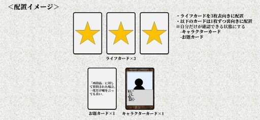 ゲーム開始時にプレイヤーは「キャラクターカード」と「お題カード」と呼ばれるカードを1枚ずつ配られ、同時に「ライフカード」と呼ばれるカードが3枚ずつ配られます。そして、プレイヤーは「キャラクターカード」に記載されている正体を知られないようにしなければならず、そんな厳しい状況の中で他のプレイヤーの正体を暴かなければなりません。また、他のプレイヤーが異なるプレイヤーから聞き出す情報は重要なヒントにもなりますので、時には協力者にもなります。ただし、情報さえ聞き出してしまえば、後はあなたの命を狙う敵です。正体が分かれば遠慮なく相手を追放してあげましょう。