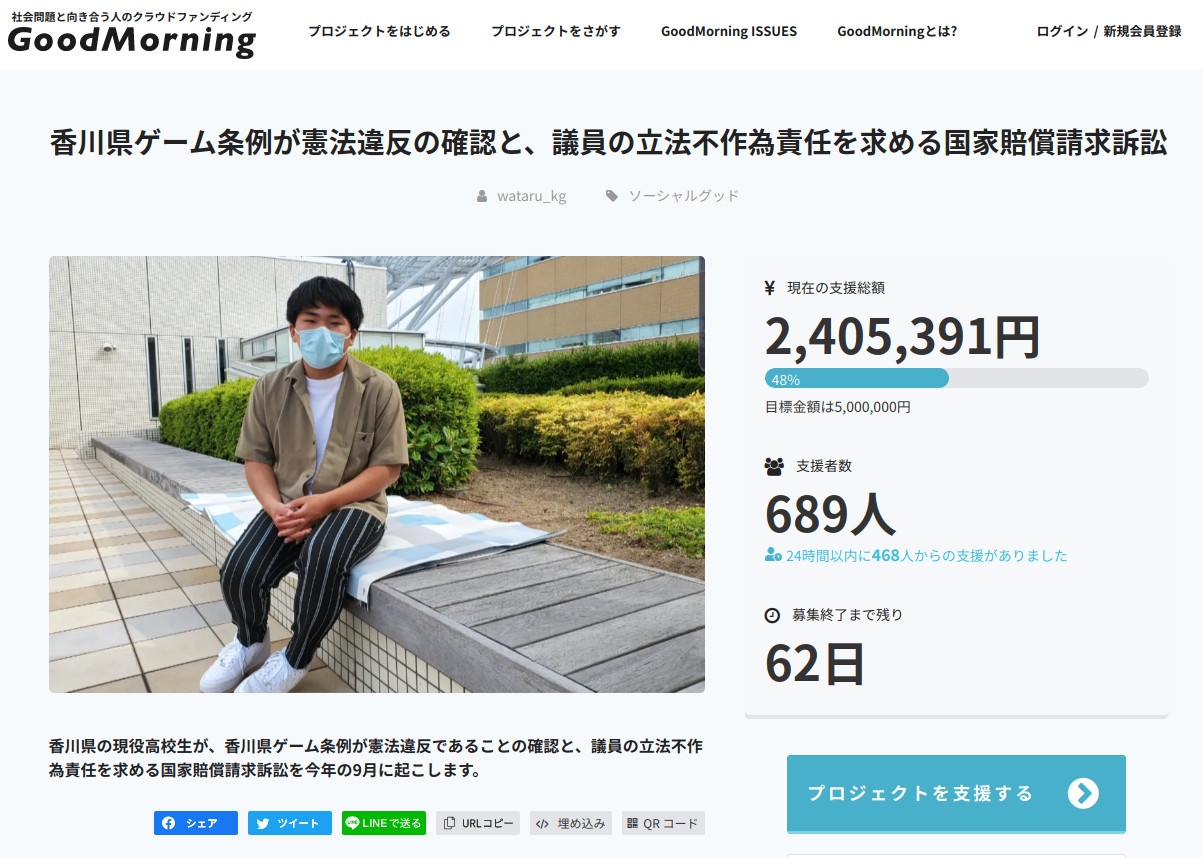 香川県の「ネット・ゲーム依存症対策条例」に対する賠償請求訴訟と憲法違反確認のため,費用を集めるクラウドファンディングがスタート