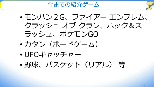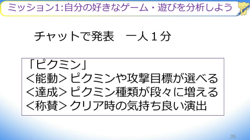 前回までの受講者が3要素について分析したゲームなども紹介された。ボードゲームやスポーツも含まれている