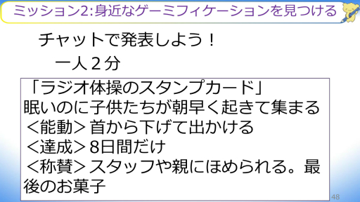 「ラジオ体操のスタンプカード」を挙げた。わざわざ朝早くから子ども達がラジオ体操に参加するのは,スタンプカードが「能動的な参加」を促すからだ。そして,8日間だけ参加すれば良いという「達成可能な目標設定」があり,「称賛の演出」としてスタッフや親に褒められたり,8日間すべて参加するとお菓子がもらえたりする。このように,3要素が含まれているというわけだ。