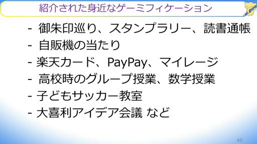 最後に岸本氏は,改めて「ゲーミフィケーションは身近にある」とし,「今後,ゲーミフィケーションを見つけたら,メモしておいてください。何かを最初からゲーミフィケーション化するのは大変ですが,メモの中から探せば応用できそうなアイデアがあるはずです」「ゲーミフィケーションを使える人は,まだまだ少ない。そういう人が増えると,日本もより楽しく幸せになるのでは」とまとめていた。