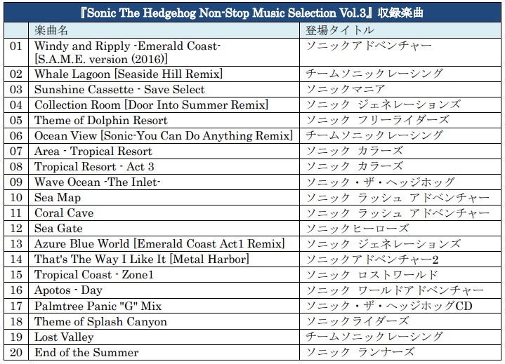 「ソニック」シリーズのコンピレーションアルバム“Sonic The Hedgehog Non-Stop Music Selection Vol.3”の配信が開始