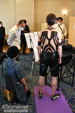 例えばツノのような髪ですが,「絵的には入らないので端折って大丈夫です」と伝えるまで,どのように再現するか悩まれていましたし,体に浮かぶライトブルーのラインも,模様全体を“身体からにじみ出てきたもの”という風に見せたいことや,ゲームのキャラクターだからこそ成立する色で,実際に人間の肌に塗るとペイントに見えてしまうのでそこはやめましょうと話しました。