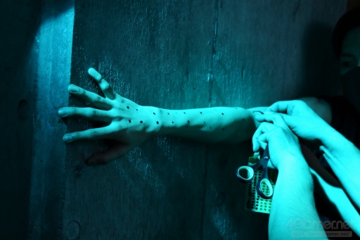腕に模様が走るシーンでは,壁に手をつく際の力の入れ方や角度など,齊藤監督自身が実演しながら何度も細かく撮影されていたのが印象的でした。どのあたりを重視し,何を確認して撮影されたのでしょう。