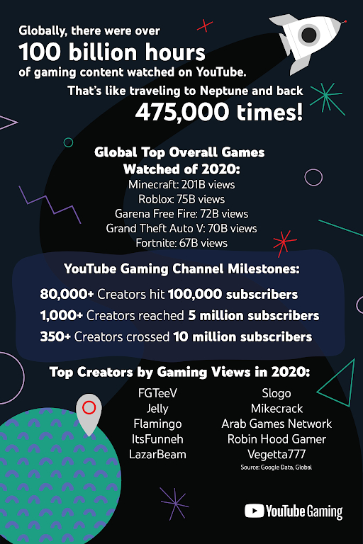 2020年は,YouTube史上ゲームが最も盛り上がった年に。4000万人のクリエイターが生み出すゲーム関連コンテンツは,全世界で1000億時間の視聴を達成
