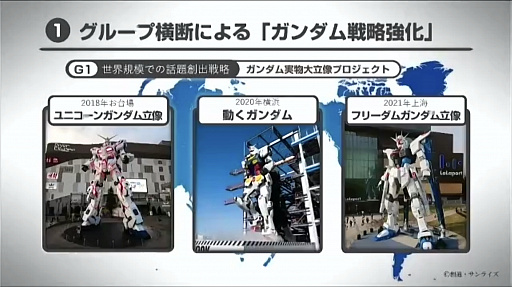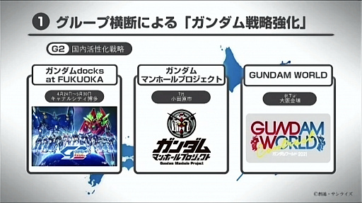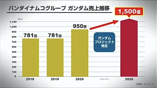 また2021年4月にはグループ内における組織再編を行い,グループを横断して展開する「ガンダムプロジェクト」を発足しており,2025年にはガンダム事業の売上を1500億円以上に成長させる計画であることも明かされた。