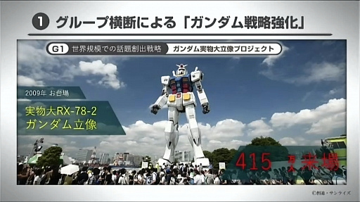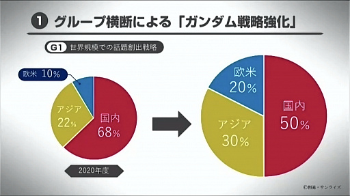 さらに前者の事業展開では3つの戦略を掲げており,その1つである「世界規模での話題創出戦略」では,現在国内68%,海外32%となっているガンダムの売上比率を,近い将来に国内50%,海外50%にすることを目指す。