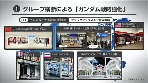 3つめの施策は,フラッグシップストアの世界展開強化だ。ガンプラの総合施設「ガンダムベース」は現在,国内5店舗,海外13店舗が展開しているが,今後もタイ,フランス,アメリカなどに拡大していくという。
