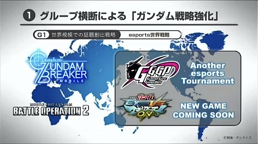 4つめの施策は,eスポーツ展開である。すでに「機動戦士ガンダム EXTREME VS. マキシブーストON」(PS4)を競技種目とする大会「GGGP」(ガンダムゲームグランプリ)を展開しているが,今後は北米展開を中心に本格的なeスポーツ参入を目指すそうだ。またこの施策により,「機動戦士ガンダム バトルオペレーション2」(PS5 / PS4)や「ガンダムブレイカーモバイル」(iOS / Android)の海外比率を高めていくという。