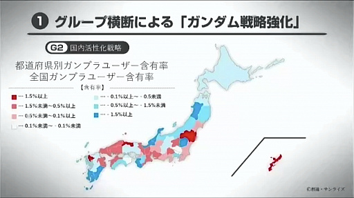 グループ横断による「ガンダム戦略強化」の2つめは,「国内活性化戦略」である。まずガンプラの国内売上はコロナ禍の巣ごもり需要で拡大しており,潜在的な需要が顕在化したという。しかし都道府県別のガンプラユーザー含有率を見ると,各地でバラつきがある。そこでガンプラユーザーの少ない地域では,タッチポイントを増やして潜在的なユーザーの活性化を目指す。またガンプラユーザーの多い地域では,コアユーザーに向き合い,しっかりとした情報を提供していくとのこと。