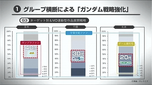 具体的には展開エリアを日本・中国・北米と分けたときに,それぞれのボリューム層が日本市場では初代「機動戦士ガンダム」を支持する40代であるのに対し,中国市場では「機動戦士ガンダムSEED」を支持する30代,北米市場では「機動戦士ガンダムOO」を支持する20代と異なっていることに着目し,ターゲットごとに戦略を変えていくという。