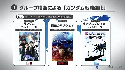 グループ横断による「ガンダム戦略強化」の3つめは,「ターゲット別&マーチャンダイジング(MD)連動型作品展開戦略」だ。これは展開エリアごとの戦略に沿って映像とMD展開を行っていくというもの。