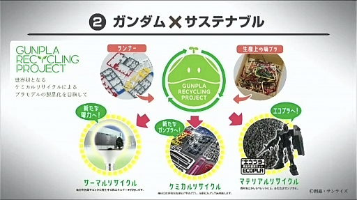 ガンダム×サステナブルをコンセプトにした事業展開としては,まず2021年3月よりスタートした「ガンプラリサイクルプロジェクト」が紹介された。これはユーザーがガンプラを組み立てたあとのランナーや生産場で発生する廃プラスチックをリサイクルして,新たな商品「エコプラ」を生み出したり,廃プラスチックをリサイクルする際に出る熱エネルギーを電力に変換したり,あるいは新たなプラモデルの材料にしたりする取り組みである。