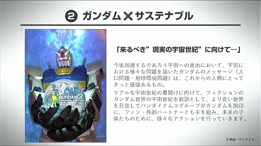 バンダイナムコグループでは、「ガンダム」における人口問題や地球環境問題のメッセージは、これからの人類にとって、価値のあるものと捉え、宇宙世紀を教訓として、「ガンダム」を旗印により良い世界を目指し、世界中のファンのみなさまや外部パートナーのみなさまと手を組み、未来の子どもたちのためにさまざまなアクションを実行してまいります。