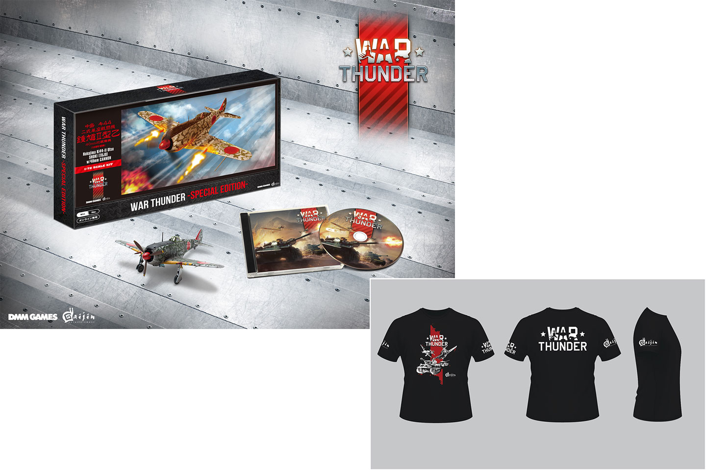 第二次世界大戦などの戦時期に活躍した戦車や航空機,艦艇などを操り,戦闘が楽しめるオンライン対戦アクション「War Thunder」の特別パッケージです。1996年10月に限定で発売された,大日本帝国陸軍の戦闘機「中島 キ44 二式単座戦闘機 鍾馗II型乙 40mm砲装備機」プラモデルの復刻版が付属しているほか,ゲーム内でさまざまなアイテムが手に入るコードが封入されています。Tシャツ(Lサイズ)をセットにして10名様に。12才以上対象(CEROレーティング:B)(関連記事)