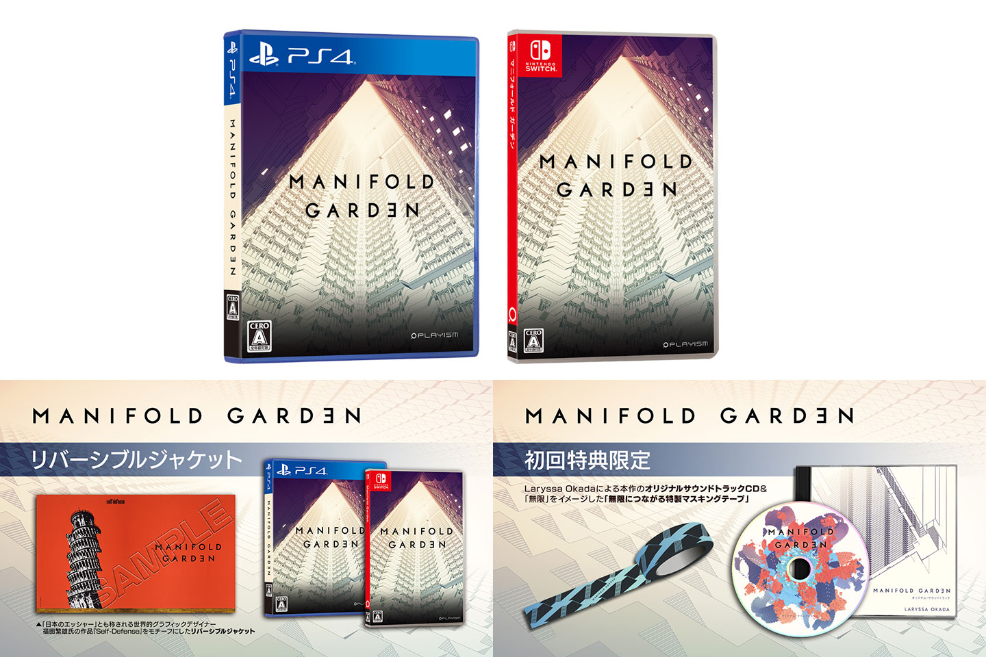 壁を床に,天井を壁にと,重力を上下左右の4方向に自由に変えられるフィールドを舞台に,設置された装置を作動させて“無機質な世界に生命を取り戻していく”というパズルゲームです。エッシャーの作品からインスピレーションを受けて制作されたとのことで,だまし絵のような空間と,パズルを解くことで鮮やかになっていくビジュアルが目をひくタイトルです。初回特典のオリジナルサウンドトラックCDとマスキングテープをセットにしてお届けします。全年齢対象(CEROレーティング:A)(関連記事)