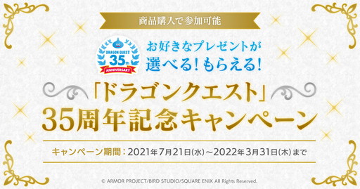 「ドラゴンクエスト」シリーズ誕生 35 周年を記念して、e-STORE で対象商品をご購入いただくと、ここでしか手に入らない豪華プレゼントの中からお好きなプレゼントを先着順で選べるキャンペーンを実施いたします。
