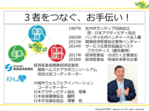 川崎氏はもともとバンダイの社員で,1997年に社内ベンチャー制度を活用して日本アクティビティ協会の前身となる社内ボランティア団体を設立した。当時は,バンダイの玩具などを用いて近隣の介護施設や自治体の予防施設で活動をしていたという。
