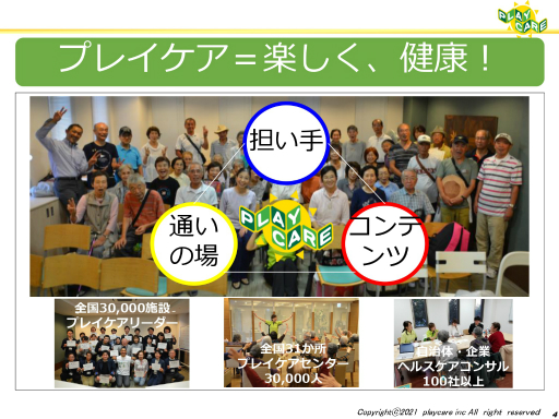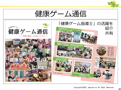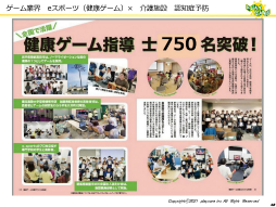 「健康ゲーム指導士」という民間資格を制定し,人材育成に注力している。健康ゲーム指導士は,ゲームを通じて健康寿命や社会参加寿命の延伸のために活躍できる人材のことだ。