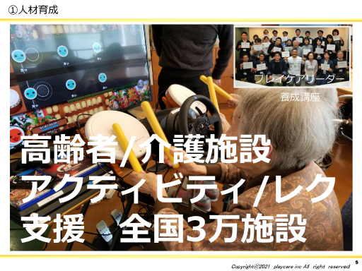 「人材育成」は,高齢者施設や介護施設の職員が日々のアクティビティやレクリエーションの内容に困っていることを聞いた川崎氏たちが,「遊びの溢れるゲーム業界や玩具業界のノウハウを活用すれば改善できるのではないか」と考えて始めた活動だ。