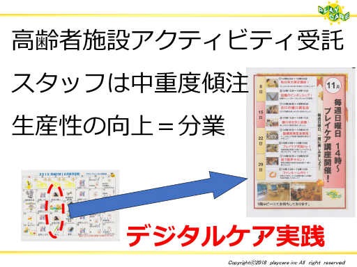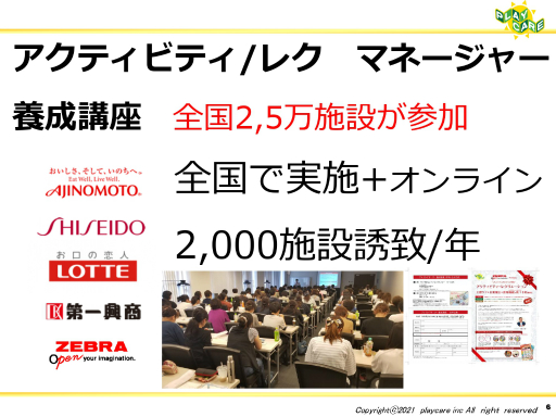 川崎氏らは,現場の職員にゲーム・玩具業界のノウハウを提供する道筋を作るべく教育体系を構築し,アクティビティやレクリエーションのマネージャーを養成する事業を立ち上げたという。