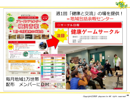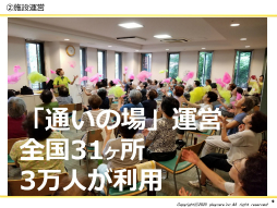 「通いの場」を運営するサポートを,協会がパッケージ化して事業展開していることが紹介された。現在,全国約11万か所ある通いの場のうち,31か所を協会が直営し,約3万人の高齢者が利用しているという。