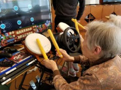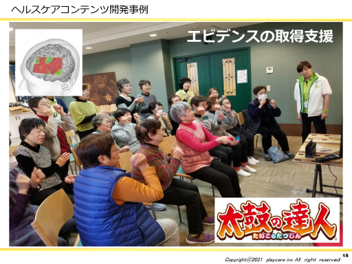 セッションでは,高齢者30人のグループが「太鼓の達人」を週1回60分プレイすることを3か月間続けたら,認知機能や運動機能などどんな変化が起きたかという事例が紹介された