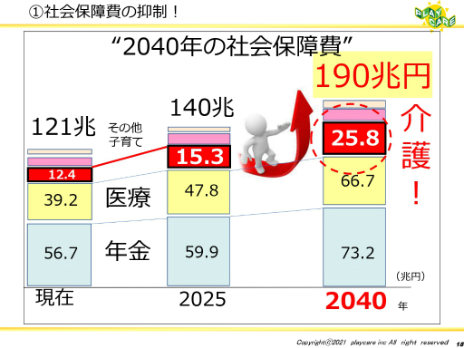 「ヘルスケアビジネスの背景と今後の方向性」についての説明がなされた。現在,日本では社会保障費をいかに減らしていくかということが大きなテーマとなっている。社会保障費の中でも,とくに介護費用の比率は年々増えていく傾向にあり,いかに抑えていくかが課題となっている。