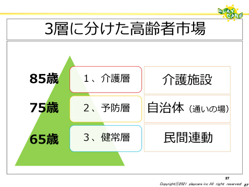 「介護層」「予防層」「健常層」に分けており,各層で活動の場が異なるので,それぞれに対するゲームのアプローチも変えている。