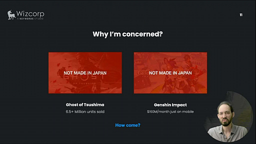 そんなハンサリ氏だが,ここ10年,日本のゲームにこれらの魅力が感じられなくなってきたため,日本のゲーム業界を心配しているという。こうした状況を象徴するものとして氏が挙げたのは「Ghost of Tsushima」と「原神」だ。前者は封建時代の日本を舞台とし,後者はアニメ風のアートワーク+日本人声優を起用した作品で,いわば日本的なゲームなのだが,どちらも日本で開発されたものではない。